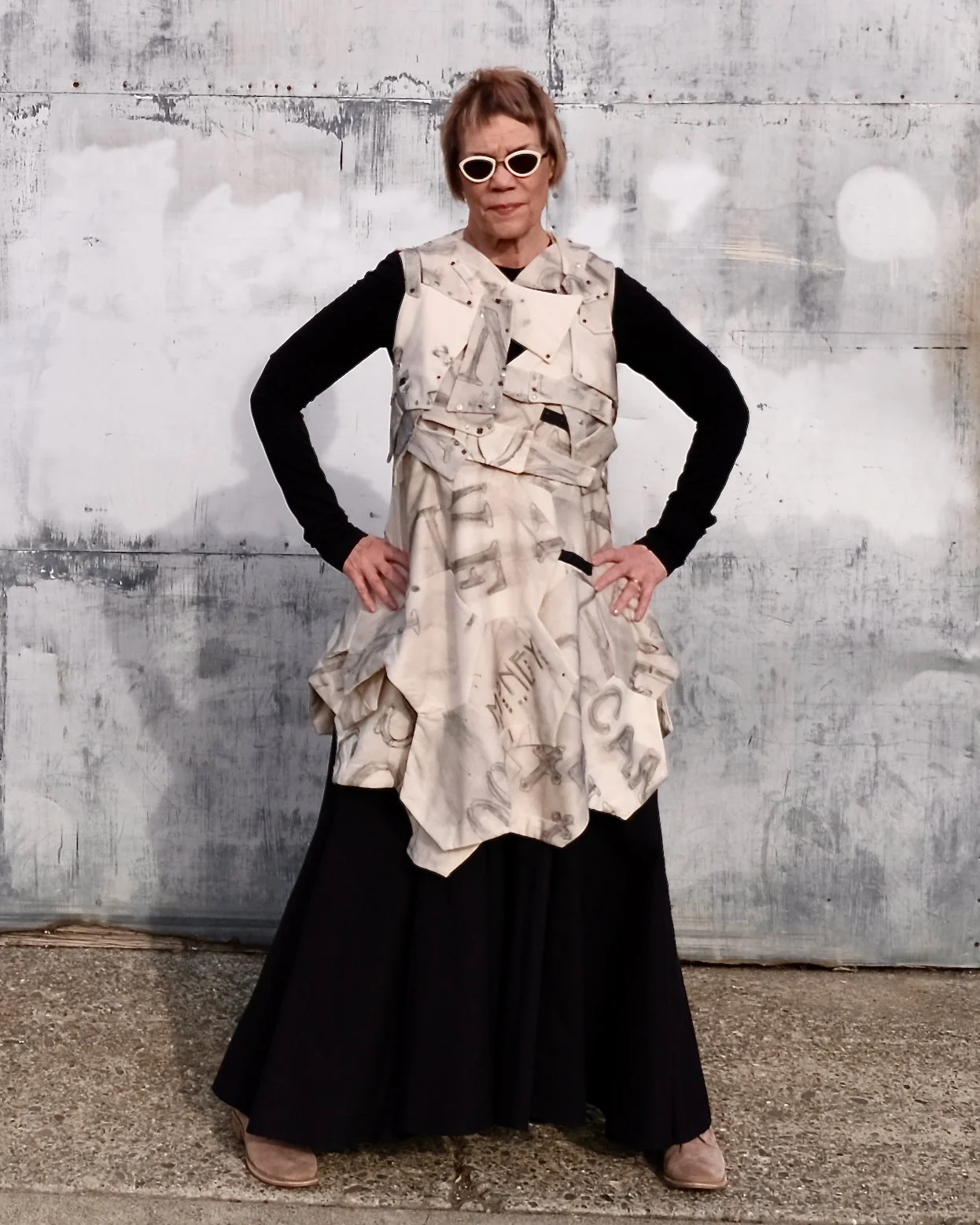 There were pieces of a heavier, more of a twill weight, muslin leftover from the original uniform dress. After writing and drawing on these leftover pieces with “Inktense” crayons, I cut out several hexagons. These large hexagons where (machine) stitched into large hunks of fabric. I draped those hunks of fabric into two sections, a left side and a right side if you will. The sections are snapped together to form a completed vest.